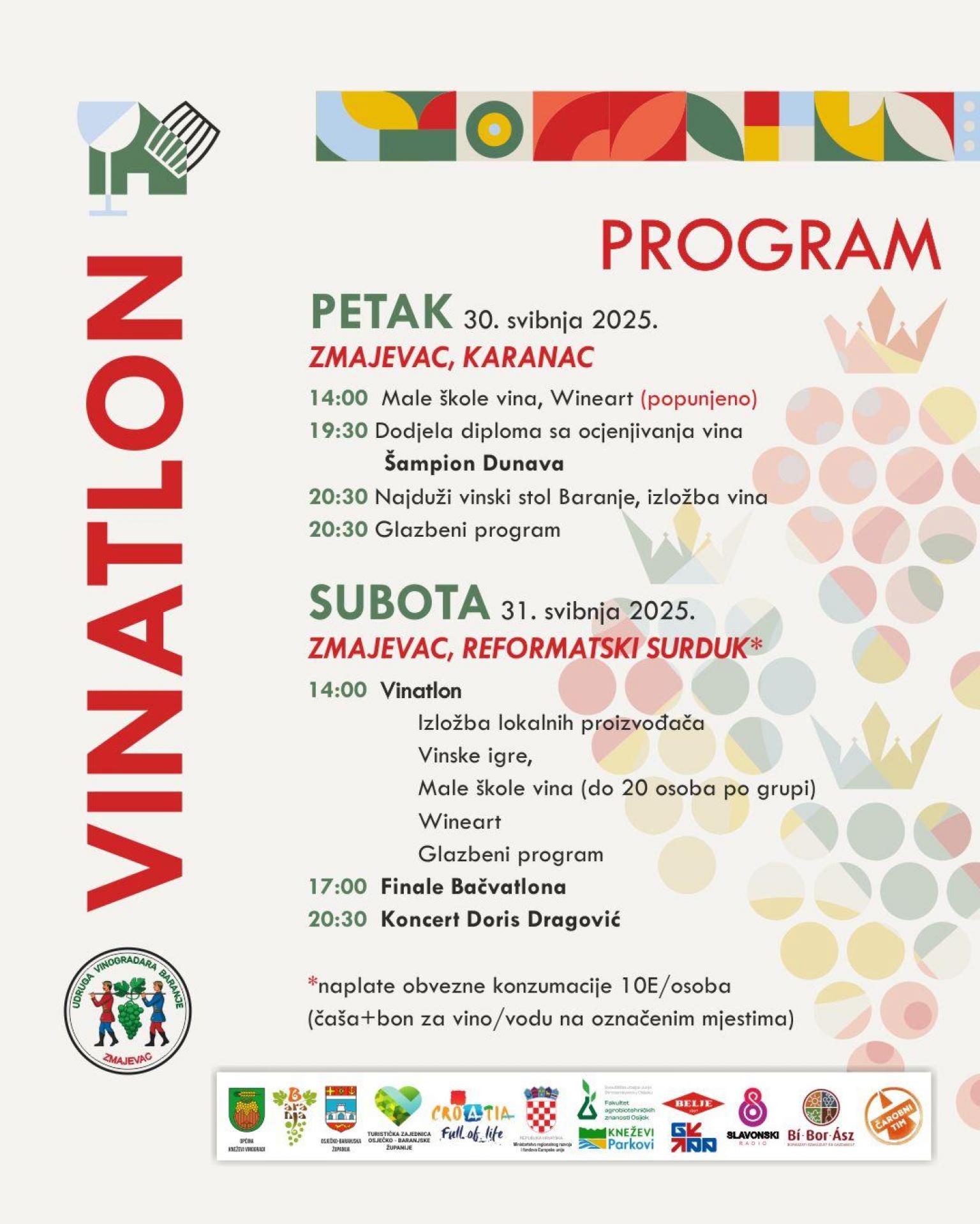 Reformatorski surduk, čudesni praporni kanjon, domaćin je od 14:00 sati izložbe lokalnih proizvođača te druženja uz vinske igre i Male škole vina (ograničeno na 20 sudionika po grupi). U 17:00 sati gledamo finale Bačvatlona – natjecanja u guranju tradicionalnih vinskih bačava, disciplina koja simbolizira snagu zajedništva i baranjsku inventivnost. Bilo da se umorite od guranja bačvi uzbrdo ili bodrenja naših natjecatelja, na putu do pozornice čekaju vas naši vinari. Njihove vinske kapljice oduševit će i najfinija nepca, a za sve koji požele predah od vina, tu su domaći proizvođači gastro delicija. Sve kulminira koncertom Doris Dragović u 20:30, čime Vinatlon spaja enološku izvrsnost s vrhunskom glazbenom atmosferom.