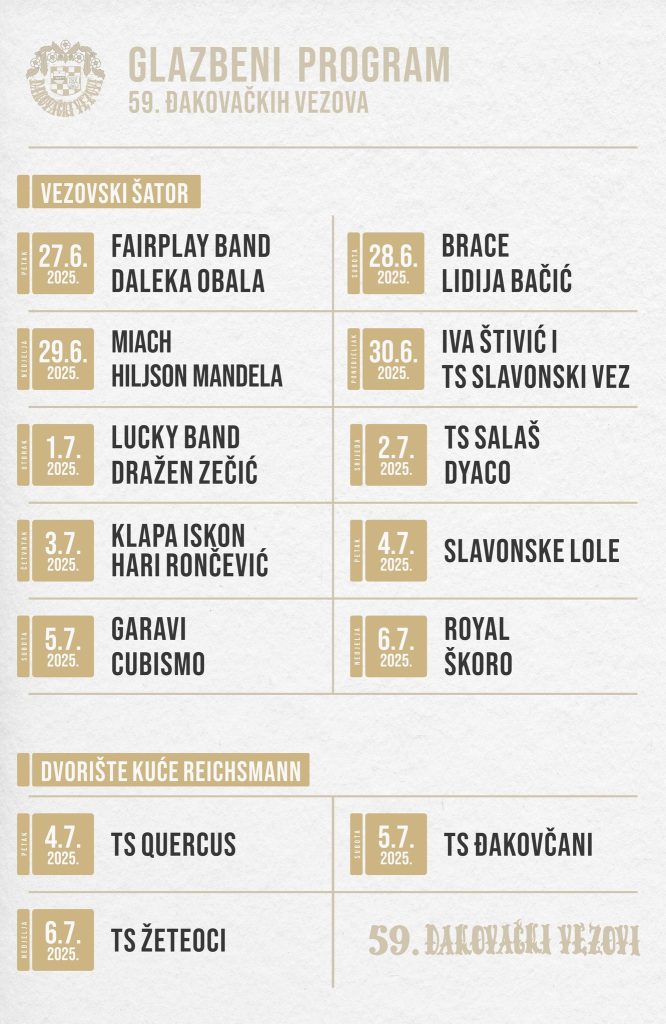 Pred nama su 59. Đakovački vezovi. Ova manifestacija, osim po svečanosti u središtvu Đakova, folklornim manifestacijama i mimohodu, sve je poznatija i po seriji glazbenih nastupa u ‘Vezovskom šatoru’, što traje tjednima prije i oko Vezova… – Donosimo vam kompletan glazbeni program 59. Đakovačkih vezova – pogledajte tko nam sve ove godine stiže u srce Slavonije! – objavili su organizatori, uz plakat, a na kojem su Škoro, Cubismo, Lidija Bačić, Daleka obala…
