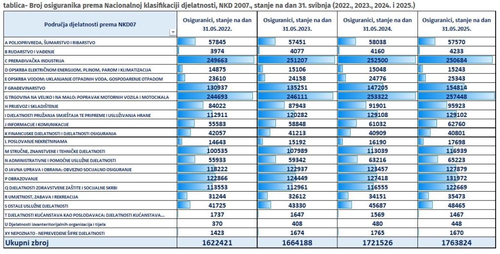 – Najveći broj osiguranika prema djelatnostima na kraju svibnja 2025. evidentiran je u trgovini na veliko i na malo; popravak motornih vozila i motocikala (257.448), prerađivačkoj industriji (250.684), građevinarstvu (154.814) i obrazovanju (131.972).