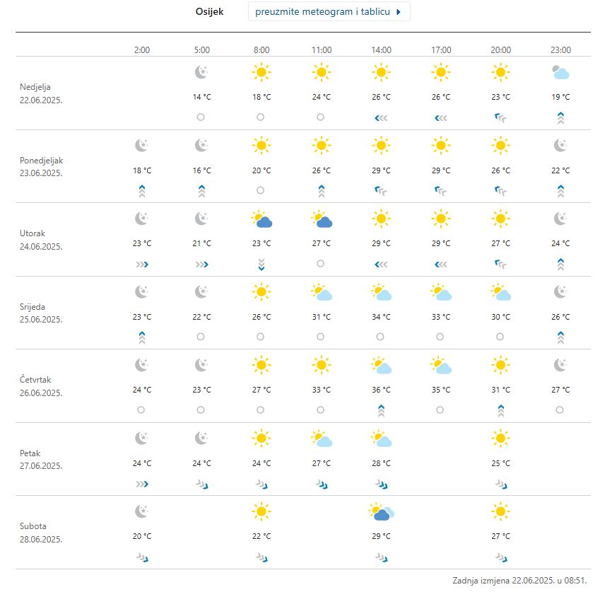 Osijek i Slavonija ‘pošteđeni’ su ‘toplinskog vala’ odmah, sada…, ali nećemo proći bez. Stiglo je upozorenje za Osijek i Slavoniju. Prve tople noći ‘prevrtanja’ po krevetu dolaze za koji dan. Ne znači to nužno 40 stupnjeva i slične temperature, već u ovom slučaju bitno niže, oko 34, ali noći će biti takve da osvježenja neće biti kao prethodnih. Uostalom, ‘toplinski val’ nije samo vrućina, pojašnjava DHMZ, uz upozorenje i 7-dnevni meteogram, koji otkriva kada dolazi ‘najgore’ u Osijek…