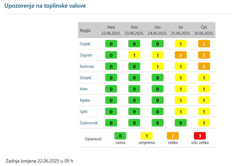 – Vrijedi od 25.06.2025 00:00:00 do 25.06.2025 23:59:59. Stupanj pripravnosti: Žuto. Toplinski val. Maksimalna temperatura > 35 °C; Minimalna temperatura > 20 °C. Budite na oprezu zbog vrućina koje se očekuju. Mogući su zdravstveni rizici među osjetljivom populacijom, ponajprije kod starijih i kod male djece objavio je DHMZ upozprenje za srijedu za Osijek i Slavoniju, istodobno najavljujući tablicom razvoj ‘toplinskog vala’ za cijelu Hrvatsku, po kojoj će, razvidno je, u Osijeku u srijedu biti na snazi upozorenje prvog, a u četvrtak već drugog stupnja, odnosno ‘narančasto’, od umjerene do velike opasnosti. Naime…