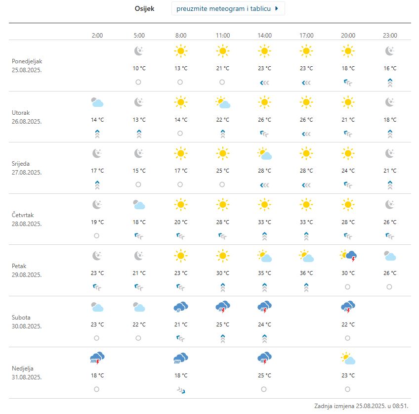 Sljedećih dana nas opet čekaju nešto više temperature, u Osijeku i do 28 stupnjeva. Ugodno, fino, skoro ljetno. Pa ipak, jutra su ‘mrzla’, ispod 10 stupnjeva. Sljedećih dana se očekuje oko 8 stupnjeva ujutro, što je temperatura za čizme. A poslijepodne će zagrijati za japanke. Prema sredini tjedna i jutra će postati toplija, a u petak bi moglo biti i 36 stupnjeva u Osijeku, stoji u 7-dnevnom meteogramu DHMZ-a, no isti dan će to priroda možda ‘polomiti preko koljena’, jer ‘nacrtane’ su munje, a onda i kišni vikend. Naime…
