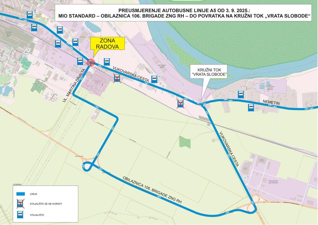 – linija A5 JOSIPOVAC – BIJELO BRDO prometuje obilazno od zone radova, iz Vukovarske ulice – desno Ul. M Divalta – na južnu obilaznicu preko čv. “Elektroslavonija” na čvor “Nemetin” – sve do povratka na kružni tok “Vrata slobode” i izlaza na trasu linije kroz Nemetin i dalje do Sarvaša i Bijelog Brda.