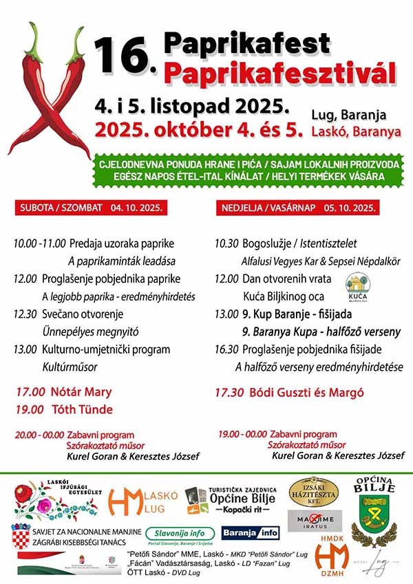 Općina Bilje i partneri najavljuju – 16. Paprikafest, 4. i 5. listopada 2025. u Lugu (Baranja). To je manifestacija posvećena paprici – prepoznatljivom simbolu Baranje. Donosi bogat dvodnevni program ispunjen tradicijom, gastronomijom i zabavom. Pa krenimo redom…