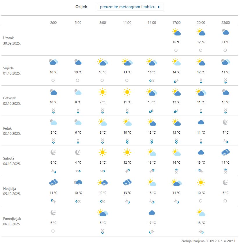– U većini krajeva promjenljivo oblačno sa sunčanim razdobljima. Ponegdje kiša, popodne uglavnom na istoku. Vjetar slab i umjeren sjeveroistočni i sjeverni. Najniža jutarnja temperatura između 5 i 10, najviša dnevna temperatura između 11 i 16 °C – prognoza je vremena za kontinentalnu Hrvatsku za srijedu 1. listopada. Istodobno, upozorenja na vremenske prilike za Osijek i Slavoniju nema. No, ‘najgore’ je što sljedećih nekoliko dana bolje vrijeme nije na vidiku. Naime…