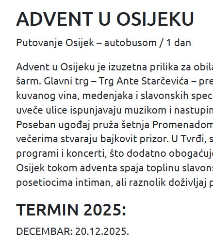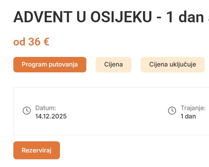 Jedna varaždinska agencija već prodaje za 36 eura aranžman za Osijek za 14. prosinca, za nedjelju. Kako se Advent zasigurno održava kroz prosinac, tu s datumom nema greške. Aranžman predviđa rani polazak za Osijek, gdje je očekivano vrijeme dolaska 10 sati, a onda… Poslije šetnje uz vodiča slijedi ‘adventiranje’, Trg Ante Starčevića…, do povratka kućama.