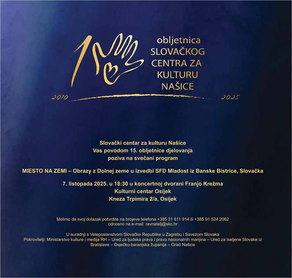 Slovački centar za kulturu iz Našica povodom 15. obljetnice djelovanja organizira svečani program u koncertnoj dvorani Franje Krežme u Osijeku, a kojeg će izvesti gosti iz Slovačke, Mladost iz Banske Bistrice. Bit će to Mjesto na zemlji – Slike s Donje zemlje. Program počinje sutra u 18:30 sati.