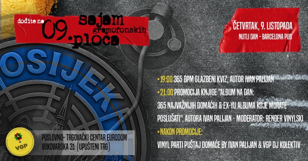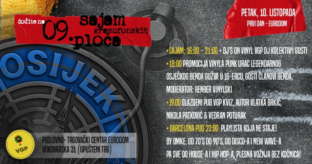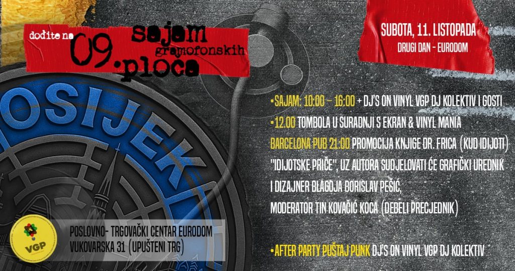 – Udruga Volim gramofonske ploče organizira deveti po redu Sajam gramofonskih ploča u Osijeku, koji će se održati od 9. do 11. listopada 2025. godine. Osijek će i ove jeseni postati središte vinilne kulture, okupljajući više od 30 izlagača koji donose ponudu od preko 35.000 gramofonskih ploča. Središnji događaj se održava na lokaciji koja odiše kultnim duhom osječke rock’n’roll scene Poslovno- trgovačkog centra Eurodom, Vukovarska 31 (bivši Radnjak i Rupa), dok se popratni program održava u suradnji s našim partnerima u bastionu nezavisne osječke scene Barcelona Pub-u (Ul. Kardinala Alojzija Stepinca 28) – javljaju iz udruge organizatora i nižu sastavnice sajma…