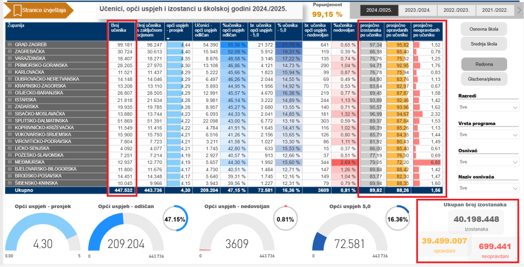 ‘Šiju’ nas Zagreb, Zagrebačka, Varaždinska, Primorsko-goranska, Karlovačka, Dubrovačko-neretvanska i Istarska. Zagreb ima 55,36% odličaka. Najbolje stoje i s onima s 5,0. Zagreb ih ima 21,75%. Bolji od OBŽ tu su još samo Zagrebačka i Varaždinska županija, tu smo na 4. mjestu. Što se padanja razreda tiče, tu smo na 10. mjestu. ‘Najbolji’ su u Međimurskoj županiji s 2,69%. U toj županiji imaju i najviše neopravdanih izostanaka prosječno po učeniku, 6,85 sati. Ali i OBŽ je po ovoj neslavnoj statistici u ‘boljem društvu’, na 6. mjestu.