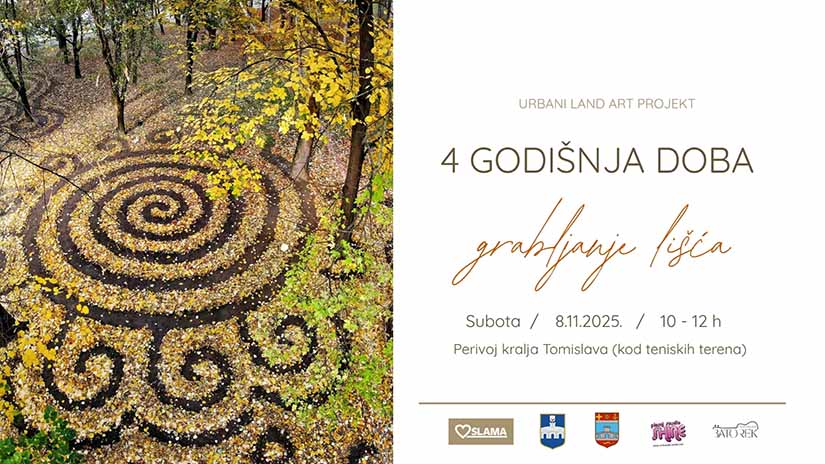 U subotu će se u Osijeku odvijati ‘urbani land art projekt’ Grabljanje lišća – 4 godišnja doba, najavio je Nikola Faller, voditelj projekta… – Projekt, pod umjetničkim vodstvom Nikole Fallera, predstavlja jesensko izdanje ciklusa 4 godišnja doba u kojem se prirodni materijali – lišće, trava, zemlja – pretvaraju u efemerne umjetničke instalacije u javnom prostoru – stoji u najavi događaja, a koji je na rasporedu u subotu, 8.11.2025. od 10 do 12 sati, u Perivoju kralja Tomislava (pored teniskih terena) u Osijeku.