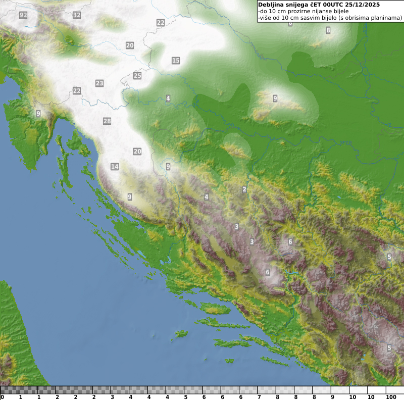 U srijedu, na Badnjak, 24. prosinca 2025. oborina će biti češća i u unutrašnjosti. Već će u noći uz zahladnjenje u Gorskom kotaru i Lici kiša prelaziti u susnježicu i snijeg uz stvaranje snježnog pokrivača. Snijega će biti i u gorju istočne i središnje Hrvatske, no vjerojatan je i ponegdje u nizinama, ponajprije na sjeverozapadu zemlje, a nije isključeno ni stvaranje tanjeg snježnog pokrivača.