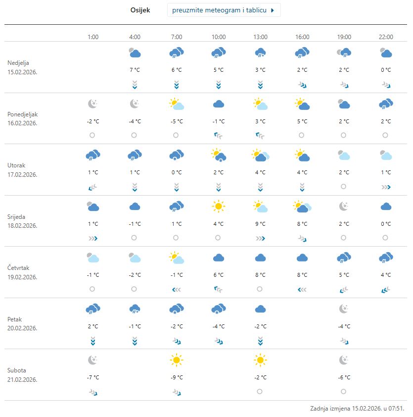 Očekujte danas i pahulje snijega u Osijeku i okolici, cijeloj Slavoniji. A i vjetar, s olujnim udarima. Za što je izdano i upozorenje meteorologa… – Pretežno oblačno, mjestimice s kišom, koja će već tijekom jutra ponegdje prelaziti u susnježicu ili snijeg. Poslijepodne postupan prestanak oborine, a zatim i smanjenje naoblake, najprije na zapadu. Puhat će umjeren do vrlo jak sjeverozapadni vjetar, lokalno i s olujnim udarima. Navečer vjetar u slabljenju. Temperatura zraka uglavnom od 2 do 5 °C, a navečer u osjetnom padu – najava je DHMZ-a, što znači kako ulazimo u par dana niskih temperatura, što rekorsmo – dolazi ‘sa stilom’…
