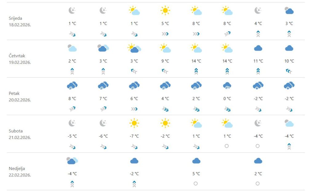 Jutros je Osijek bio na -5 stupnjeva. Sutra ujutro bit će to lakše malo, oko 1 stupanj. I sljedećih par dana bit ćemo u plusu oko sredine dana, ali zima još nije završena, stiže još jedan ‘zimski ugriz’, već ovaj vikend. Naime… – Postupno smanjenje naoblake, već ujutro na sjevernom Jadranu, a tek navečer na krajnjem jugu i istoku zemlje. Prijepodne još mjestimice kiša, u unutrašnjosti i susnježica, glavninom u gorju i snijeg. Poslijepodne je u kopnenim krajevima moguć poneki pljusak, posebice u središnjoj i Gorskoj Hrvatskoj. Vjetar slab do umjeren sjeverni i sjeveroistočni, na istoku i sjeverozapadni. Najniža temperatura zraka od -1 do 4, najviša dnevna od 6 do 10 °C – pronoza je za utorak, a onda…