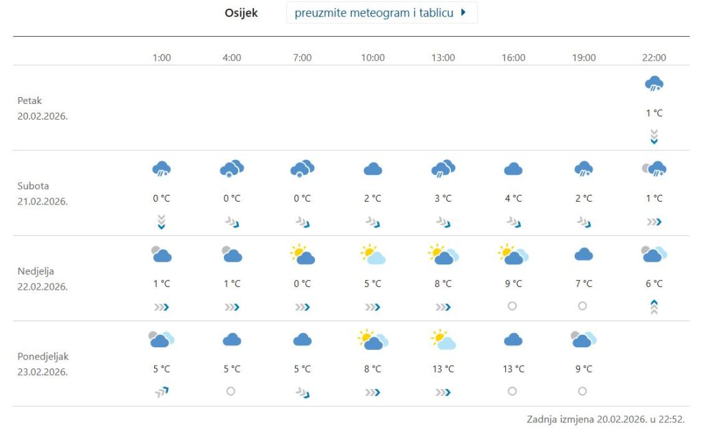 Trodnevni meteogram DHMZ-a puno je mjerodavnija računala prognoza od 7-dnevnog. A on kaže kako već u nedjelju možemo očekicati i 8 stupnjeva u Osijeku, u ponedjeljak i 13. Jutarnjih minusa u sljedećim danima više neće biti. Za sada. Pogledajte 3-dnevni meteogram…