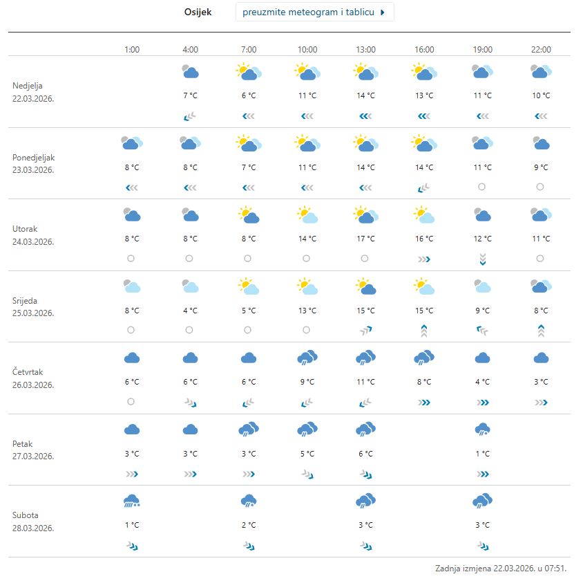 Iskoristite što je još ostalo od ovog vikenda, jer sljedeći nema neku perspektivu s vremenskim uvjetima. U petak navečer, oko 19 sati, mogla bi uz kišu krenuti i susnježica u Osijeku i Slavoniji, a koja bi se nastavila i u subotu ujutro. Stat će, razumije se, ali bit će to hladan dan, s ne više od 3 stupnja do kraja dana. Dakle, pred nama je ‘ugriz zime’, ono što se dogodi svakog proljeća, taman da ‘za*ebe’ procvjetale voćke. Istina, za njih je najopasniji mraz, minus ujutro, ali to se, za sada, ipak neće dogoditi.