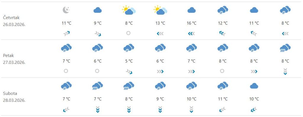 – Nestabilno, vjetrovito i osjetno hladnije, osobito na kopnu. Pretežno oblačno, povremeno kiša i pljuskovi s grmljavinom. Puhat će umjeren i jak sjeverni i sjeveroistočni vjetar, na udare i olujan, na istoku i istočni. Najviša temperatura od 10 do 15 °C – prognoza je za kontinentalnu Hrvatsku za danas, dok se u subotu očekuje… – Promjenjivo, često i pretežno oblačno te i dalje vjetrovito. Mjestimice kiša. Puhat će umjeren do jak, na udare ponegdje olujan sjeverni i sjeveroistočni vjetar. Najviša temperatura od 8 do 13 °C.