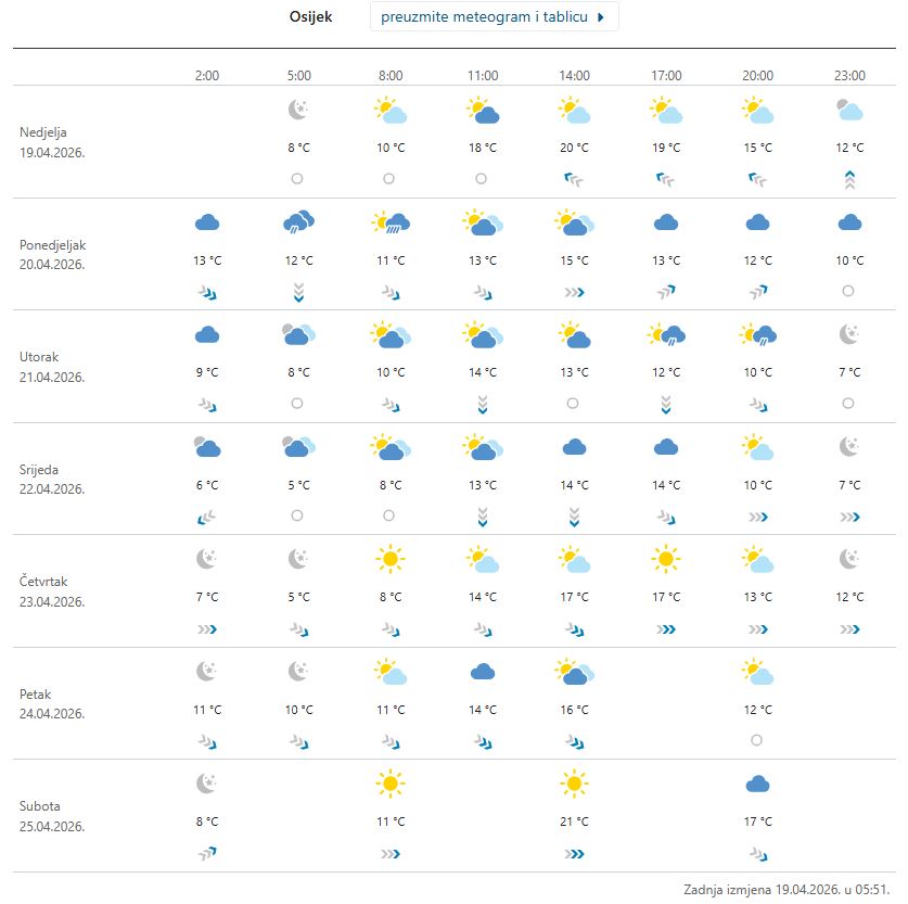 Danas (nedjelja, 19. travnja) u Osijeku i Slavoniji još promjene vremena biti neće. Drugdje da, kod nas ne. Mi ćemo uživati na oko 23 stupnja, uglavnom u sunčanom vremenu. Pa ipak, do promjene dolazi sutra i kod nas (ponedjeljak, 20. travnja), no to neće biti ni upola dramatično kako je izgledalo u dugoročnim prognozama otprije nekoliko dana. Da, past će temperatura. Da, past će i ponešto kiše. Ali, neće to biti nekoliko kišnih i hladnih dana, već više onako – proljeće. Tako barem sugerira 7-dnevna prognoza DHMZ-a. Naime, nema ni ‘alarma’ za promjenu vremena. Pogledajte…