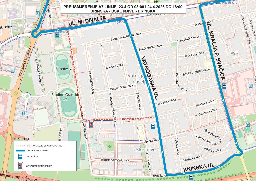 – Djelomično izmještanje trase autobusne linije A7: DRINSKA – USKE NJIVE – DRINSKA – najavljuje GPP i objašnjava… – Zbog izvođenja radova u Ulici W. Wilsona u Osijeku, od četvrtka 23. travnja u 08:00 sati do petka 24. travnja 2026. u 18:00 sati, za promet će biti zatvoren zapadni kolnički trak navedene ulice na dionici od Ulice M. Divalta do južne prilazne ceste (kod kućnog broja W. Wilsona 13), i to za vozila koja se kreću iz smjera sjevera prema jugu.