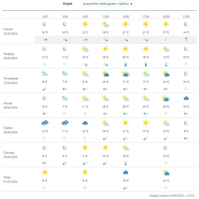 Za nedjelju je jednako dobra, ali već s jačim sjevernim vjetrom, što u ponedjeljak vodi nižoj temperaturi, oborinama do srijede, a onda…!? Sedmodnevni meteogram kaže da roštilj na 1. svibnja nije upitan u Osijeku i Slavoniji. Pogledajte…