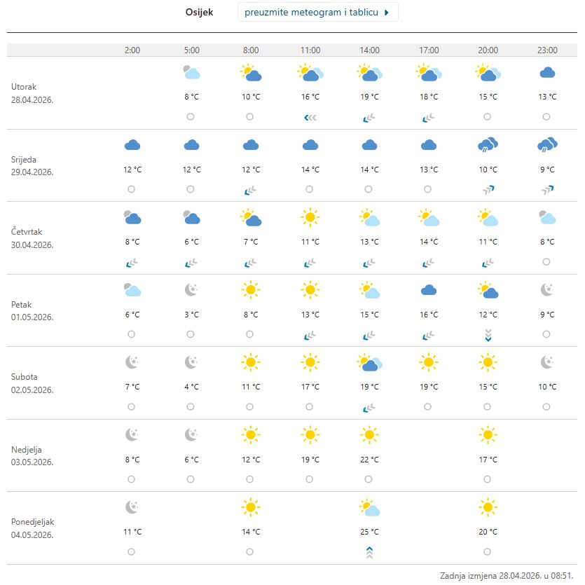 – U unutrašnjosti pretežno oblačno mjestimice s kišom i osjetno svježije. Vjetar slab do umjeren sjeverni i sjeveroistočni. Najniža temperatura zraka od 6 do 11, najviša većinom od 12 do 16 °C – prognoza vremena je za srijedu, a za četvrtak, petak i kasnije – zavirili smo u 7-dnevni meteogram DHMZ-a.